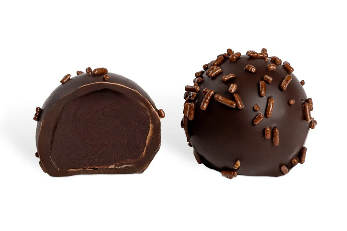 Dark chocolate cupcake ganache center in a dark chocolate shell, topped with chocolate sprinkles
