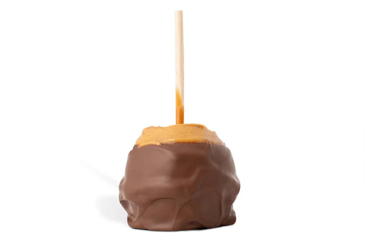 Caramel-covered Granny Smith apple dipped in creamy white confection and peanut butter mixture, drizzled with our rich milk chocolate