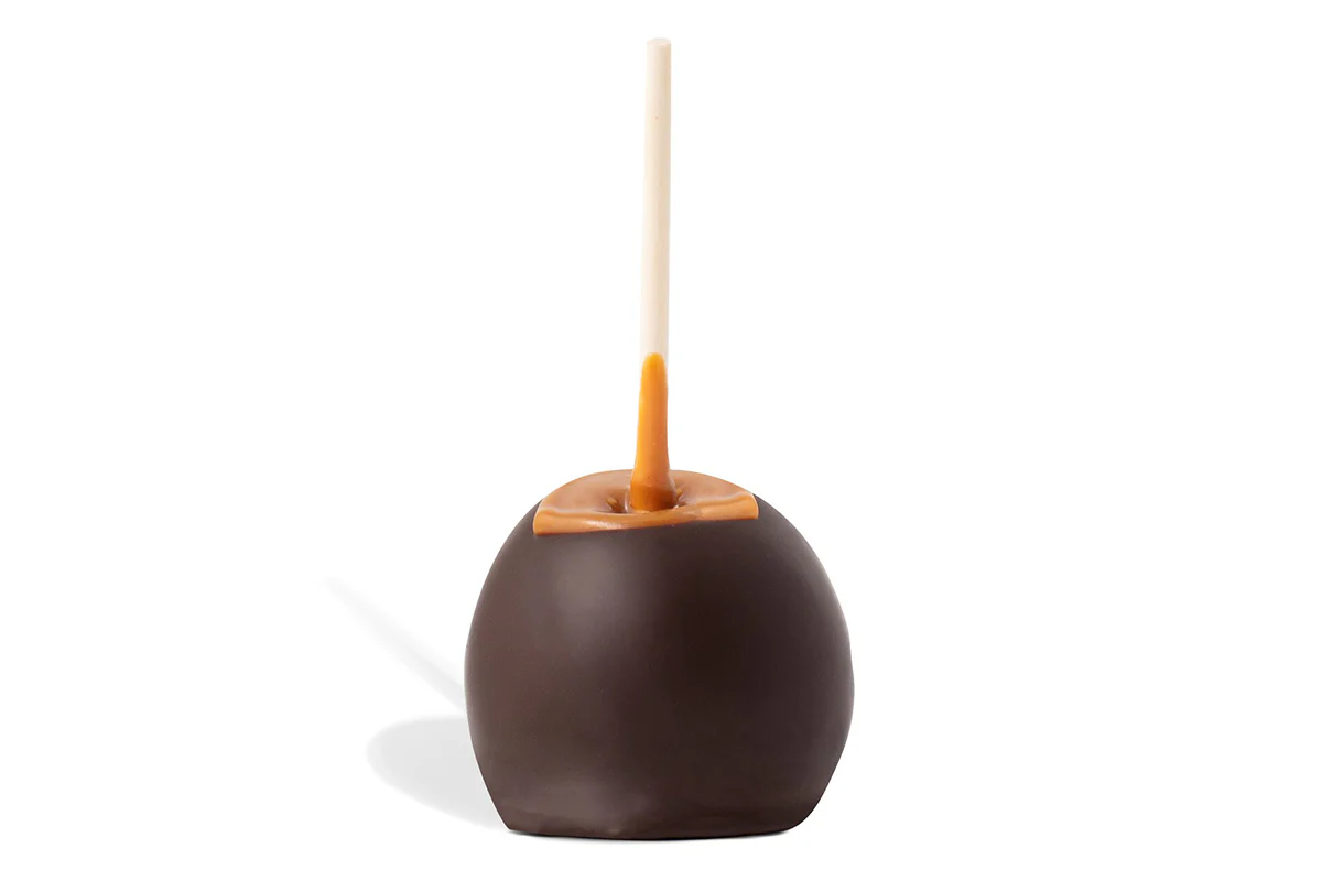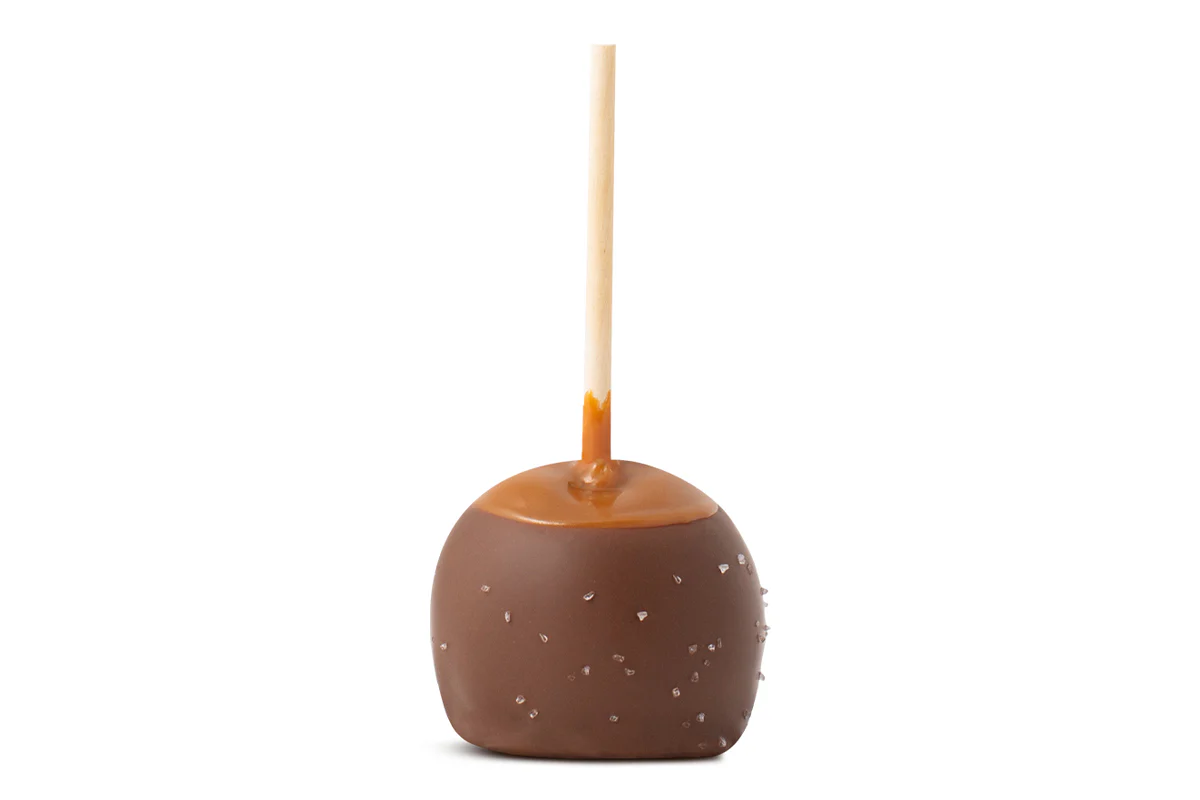 Caramel-covered Granny Smith apple dipped in milk chocolate, sprinkled with sea salt