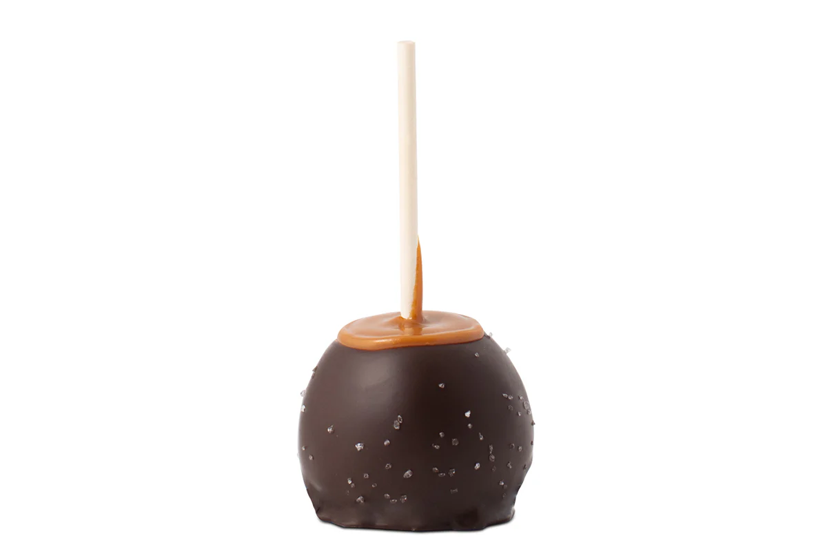 Caramel-covered Granny Smith apple dipped in dark chocolate, sprinkled with sea salt